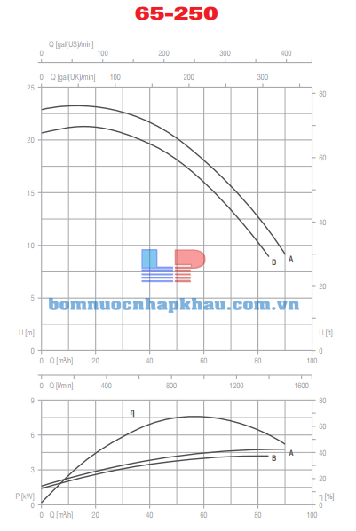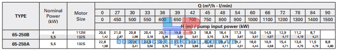 Biểu đồ lưu lượng đầu bơm trục rời Pentax CA 65-250A