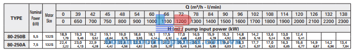 Biểu đồ lưu lượng đầu bơm trục rời Pentax CA 80-250A